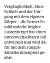 Lesen Sie in der jüngsten Ausgabe des Kunstbulletins über meine Ausstellung im alten Friedhof in Monthey. «Die beinahe skulptural wirkenden Fotosujets von Brigitte Lustenberger entfalten eine erratische Kraft und fügen sich in...